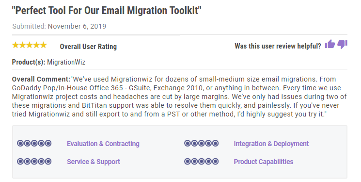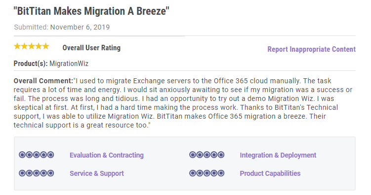 Case studies hold some of these answers – as does /r/Office365 and /r/msp – but there’s another place with an extensive library of reviews on MigrationWiz: Gartner Peer Insights.