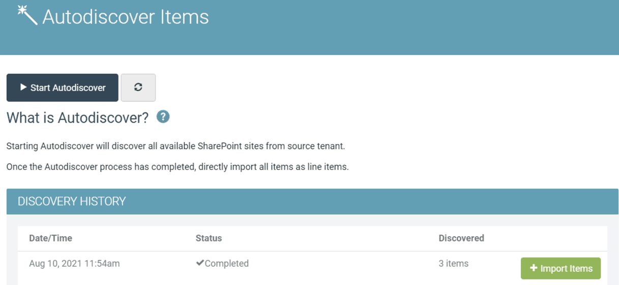 6. Once discovery is complete, click on ‘Import Items’ to add the discovered sites and document libraries as line items to the project.